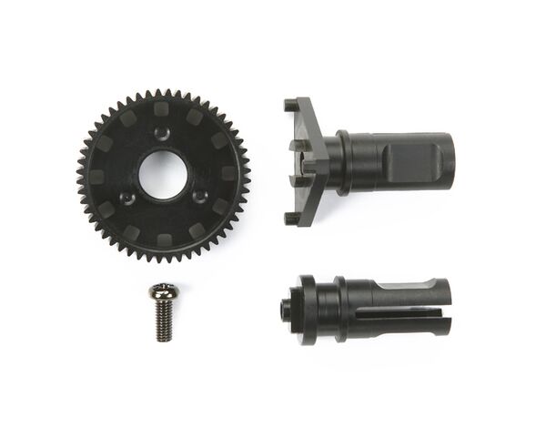 The TA06 Rear Direct Coupling (52T) replaces the kit standard gear differential unit to help make it easier to deliberately make the rear tires slide. This can also be used in the FF-03R chassis' front gearbox to provide superb traction and acceleration.