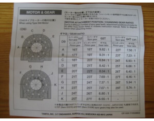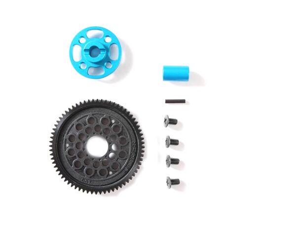 This TT-02 chassis option part is a gear set featuring a newly-designed aluminum spur gear mount and spacer. It enables gear ratio settings from 9.82:1 to 6.55:1, and it can also be used in conjunction with a separately-sold 64T spur gear for lower gear ratios.