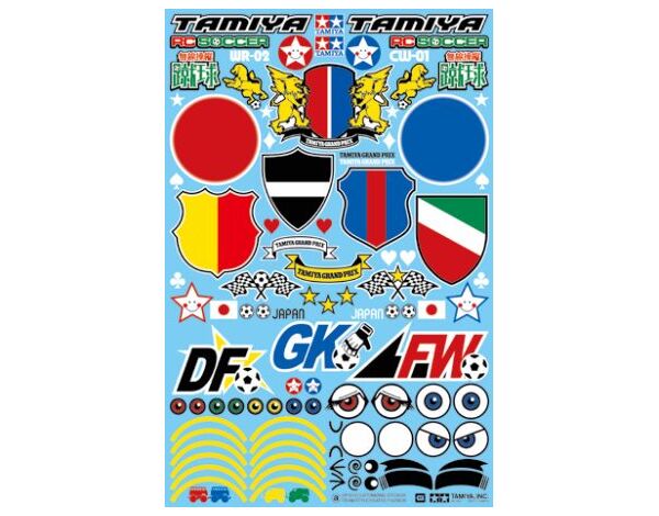 This sticker set celebrates R/C Soccer. Teams of R/C models feature color-coordinated livery. In order to provide a sporty and fun look to the models in play, drivers can use this sticker set, which is full of original sticker designs, to add to the color scheme. They are compatible with any model, so even if you are not taking part in R/C Soccer you can still give your model a make-over! The sheets include both fun logos and patterned designs.
