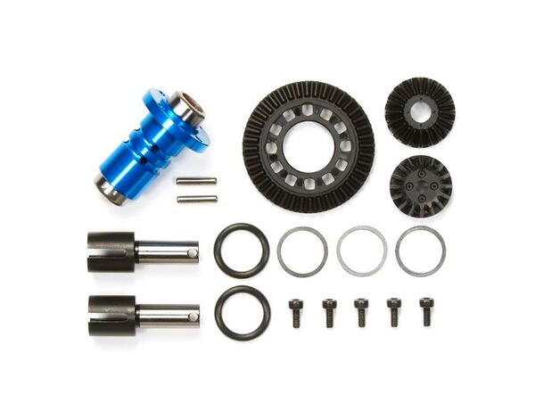This is a front one-way set designed to be used with the TB-04 shaft-drive, touring car chassis platform. It cancels the brake function of the front wheels and provides sharper handling. Not only that, it also allows improved acceleration when compared with a ball differential.