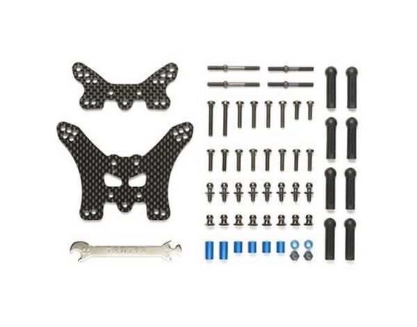 This option part set includes 3mm thick carbon fiber versions of the FRP TT-02B damper stays (Items 54556-7). Rigid carbon fiber will give improved rigidity over kit standard plastic parts.