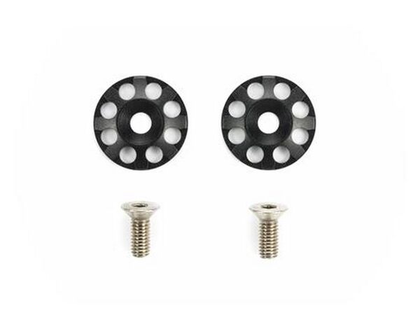 These lightweight 14mm-diameter aluminum components stabilize polycarbonate racing wings used on R/C cars. Compared to the standard attachment method, these wing washers will allow the wing to be more effective. Furthermore, they provide protection in the event of crashes and rolls.