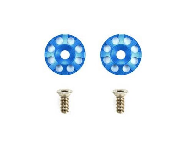 These lightweight 14mm-diameter aluminum components stabilize polycarbonate racing wings used on R/C cars. Compared to the standard attachment method, these wing washers will allow the wing to be more effective. Furthermore, they provide protection in the event of crashes and rolls.
