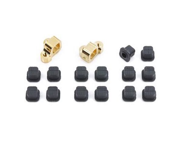 These are heavier brass versions of the TAMIYA new adjustable suspension mount designs found on the TRF420 chassis kit. The brass version will add extra weight compared to aluminum counterparts. There are three different types of mount, each with different dimensions. The included bushing sprue contains 7 pairs of different bushing types, each type with a different hole for the suspension shafts, giving a total of 25 potential shaft offset positions to fine tune your TA-07, TB-05, TRF419, and TRF420 to different track configurations and conditions.