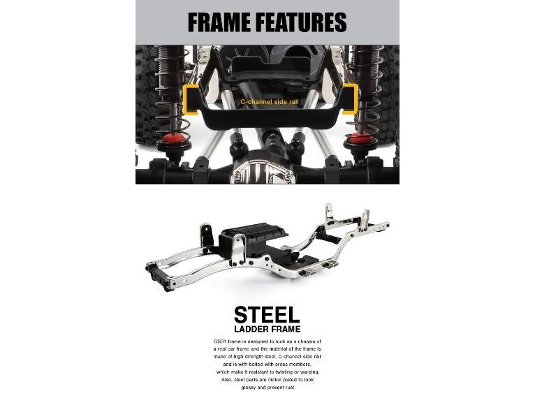 Realistic GS01 chassis with high strength Nickel plated steel c-channel side rails