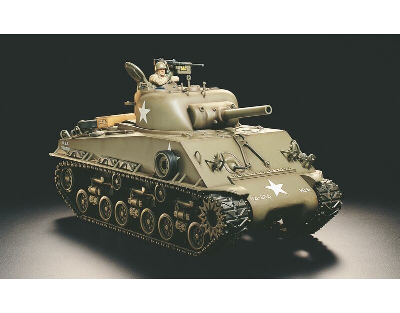 TAMIYA - Funktionsmodellbau der Spitzenklasse. Der US M4 Sherman mit 105mm Haubitze wurde als Feuerschutzfahrzeug entwickelt und mit einem 9-Zylinder 4-Takt-Sternmotor ausgestattet. Der Motor wurde ursprünglich für den Einsatz in Flugzeugen entwickelt und ermöglichte eine Höchstgeschwindigkeit von rund 40 km/h. Das Modell im Maßstab 1:16 wird von 2 Elektromotoren Typ 380 angetrieben. Die Motoren werden unabhängig voneinander gesteuert und erlauben so das Drehen auf der Stelle. Zum Lieferumfang gehören die DMD-Kontrolleinheit T-05 und das Multifunktionsmodul MF-02. Das Soundmodul gibt sämtliche Geräusche wider, die Motorgeräusche wurden an einem Continental R975-C4 9-Zylindermotor aufgenommen. LEDs simulieren sogar das Mündungsfeuer und der Rückstoß beim Abschuß der Kanone wird auch simuliert.