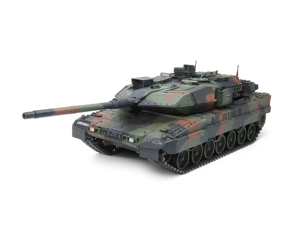 Dieser ferngesteuerte Panzer im großen Maßstab 1/16 ist eine Nachbildung des deutschen Kampfpanzers Leopard 2 A7V. Dank umfassender Recherchen am tatsächlichen Panzer konnten die Designer von Tamiya die aktualisierten quadratischen Scheinwerfer, die zusätzliche vordere Panzerplatte und die aktualisierte Turmheckform originalgetreu darstellen.• R/C-Modellbausatz im Maßstab 1/16. Länge: 701mm, Breite: 241mm, Höhe: 190mm. Gewicht: 4.900g.• Genau wie der Panzer in Originalgröße verfügt dieses Modell über eine Einzelradaufhängung an allen Rädern mit Drehstäben für überragende Mobilität. Die Querlenker sind aus Druckguss (Kunststoff für Artikel 56020 (1/16 R/C Leopard 2 A6)) für höhere Qualität und Zuverlässigkeit.• Vormontierte Ketten haben eingelegte Gummipads.• Der Gewehrlauf besteht aus Aluminium und das Chassis aus ABS-Kunststoff.• Die neue Steuereinheit DMD T-12 verfügt üb