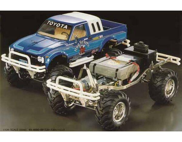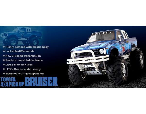 The R/C Toyota Bruiser was originally released in 1985. It featured a realistic 3 speed transmission and a solid axle leaf spring suspension. The 2012 edition comes with the same spectacular features. The original layout of the chassis has been kept while modern improvements have been discretely incorporated to bring added fun and function.