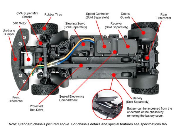 •Special feature 5 : Holes in the chassis bottom help remove any debris which may block steering movement during off-road use