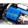 Brake disc-shaped wheel hubs (silver color) and battery holder (blue) are metal-plated parts.