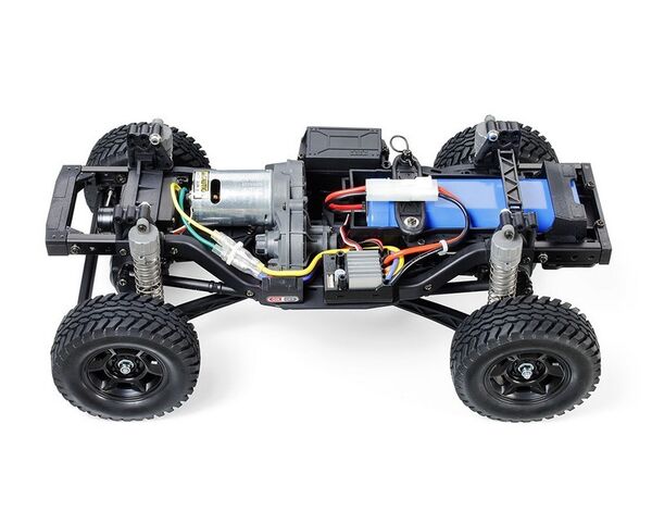 Das CC-02 Chassis wurde für eine Vielzahl von Off-Road-Szenarien, einschließlich felsigem Gelände, entwickelt. Der Leiterrahmen des CC-02 Chassis wurde von großen Fahrzeugen inspiriert und ist die Basis für seine überlegene Robustheit. Der Motor befindet sich in Längsrichtung hinter der Vorderachse, Getriebe und Verteilergetriebe sind getrennt, und Kardanwellen übertragen die Kraft auf die Differentialgetriebe vorne und hinten. Die starre Vierlenkeraufhängung vorne und hinten mit CVA-Öldämpfern sorgt für umfassende Kontrolle, auch auf schwierigen Felsabschnitten. Dieses Modell ist mit schwarzen Rädern und griffigen Blockprofilreifen ausgestattet.