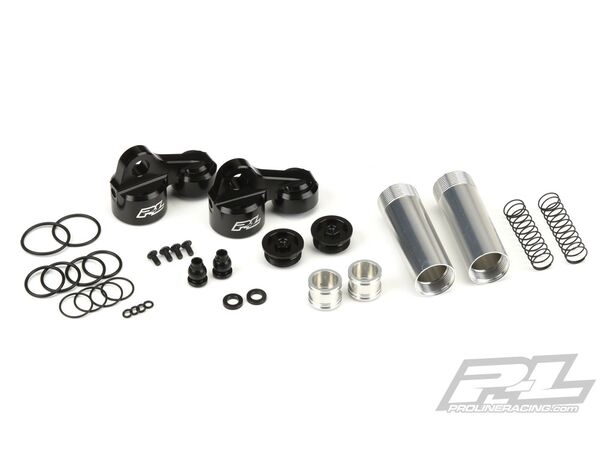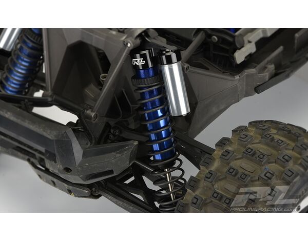 This is a pair of Ultra Reservoir Shock Caps for X-MAXX®. X-MAXX® fans – Are you ready to take the Performance of your X-MAXX® to the Next Level? Introducing Pro-Line's Ultra Reservoir Shock Caps that fit directly onto the stock X-MAXX® shocks and transform them into fully functional Reservoir Shocks! The additional Reservoir provides more oil volume to your X-MAXX® shocks which results in cooler shock temps and improved shock consistency. The Reservoir Piston compensates for the volume of the Shock Shaft delivering Plush Performance over small bumps and large jumps just like full-scale shocks! The included Shock Cap, Reservoir, Piston and Bottom Cap have all been expertly CNC machined out of high grade Aluminum to exacting specifications to meet the demands of the enormous X-MAXX®. The included O-Rings provide the sealing you need and Delrin upper Pivot Balls are included for optimum performance
