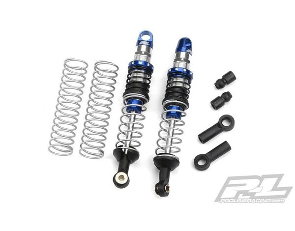 This is a pair of Pro-Spec Scaler Shocks. Pro-Line is proud to announce the next generation of RC Shock Technology with our all-new Pro-Spec Scaler Shocks! The new Shocks feature CNC machined Aluminum Shock Caps, Collars, Bodies, Bottom Caps and Hard Chrome Coated Steel Shock Shafts all made to exacting tolerances. X-Ring seals are used as the main shaft seal for smooth, low friction action and to prevent leaks. Just like Pro-Line’s other Pro-Spec Shocks, the new Scalers are meant to stand out from the crowd with bright Chrome and Blue anodizing. From the top mounting hole to the bottom mounting hole these Pro-Spec Scaler Shocks measure out to be 90mm at full extended length and collapse down to about 64mm and they include extra 5mm longer Shock Ends to increase the shock length! These shocks are perfect for super scale rigs! Just like Pro-Line’s extremely popular PowerStroke Shocks, the Pro-Spec Scaler Shocks come mostly pre-built (just add oil) and are designed to fit on many popular crawler vehicles. They also include Scale looking and performing Dual Rate Springs or optional Single Rate springs.