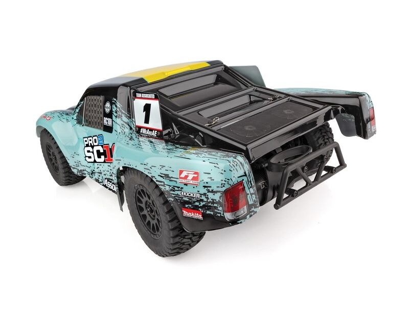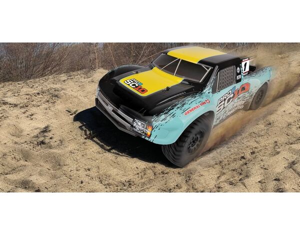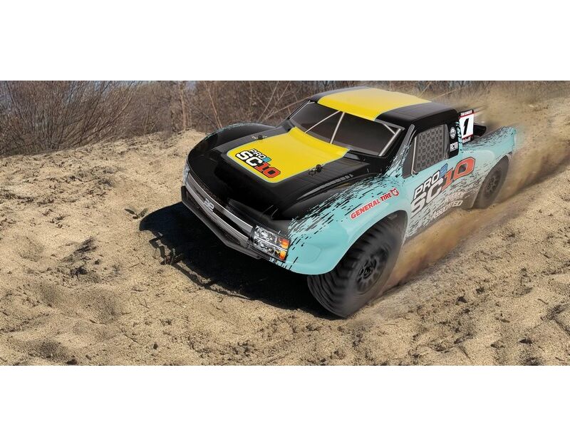 Der Team Associated Pro2 SC10 ist ein fahrfertiges RC-Modell und eine Nachbildung der Pro-2-Off-Road-Renntrucks. Die Grundlage des Pro2 SC10 bildet ein Short-Course-Chassis mit Heckmotorkonfiguration, das viele Teile mit der äußerst erfolgreichen Plattform RC10SC5M gemeinsam hat. Einstellbare Aluminium-Big-Bore-Stoßdämpfer mit Schraubenfedern, gedichtetes Kegeldifferenzial und robuste CVA-Antriebswellen gehören zur Serienausstattung des Pro2 SC10. Für stundenlangen High-Speed-Spaß ist das Modell ist mit einem wasserfesten Brushless-Regler und 3300 kV-Motor von Reedy ausgestattet. Um die Power auf den Boden zu bringen, verfügt der Pro2 SC10 über realistische Method Felgen und Rennreifen speziell für den Off-Road-Einsatz.