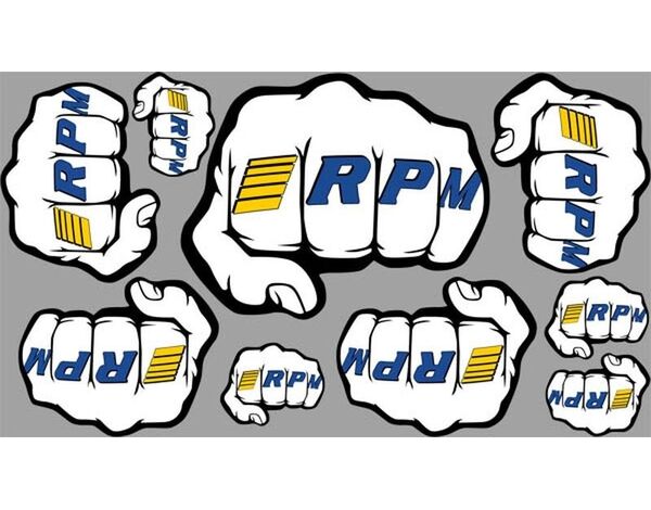 70020 RPM Fist Logo Decal Sheets You run RPM parts on your favorite ride and want to show off that fact, but standard logo decals bore you, right? Our new “Fist” logo decals will punch a hole in that problem! These new logo decals are a fun and interesting way to show off the fact that your RPM parts are on-guard and ready to defend your vehicle from the worst punishment that can be thrown at it. The RPM logo of our new decals is “tattooed” on the knuckles of a brawler’s fist, showing off the strength and endurance of RPM products. Included are two sheets of decals for a total of 2 – large 3” x 2-5/16” (76mm x 59mm), 8 – medium 1.9” x 1.5” (48mm x 38mm) & 8 – small 1” x 0.8” (25mm x 20mm) decals. These decals are exclusive to this part number. They will not be available as an extra in our parts packages like our normal logo decals (RPM #70005) so get a set now and show off your support for the RPM parts on your ride in a unique and fun new way!