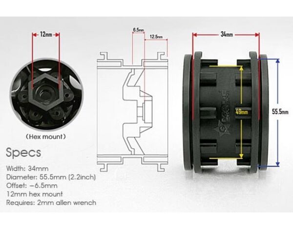 Fits 12mm hex hubs and 2.2 inch size tyres