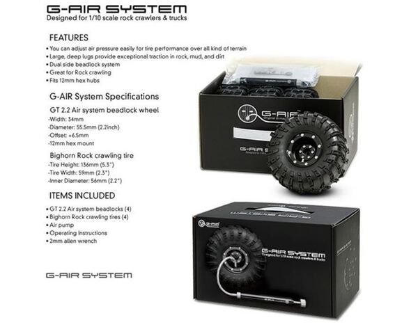 The Gmade 2.2 G-Air Beadlock Wheel System is a one of a kind air inflated crawler wheel system that allows you to adjust the air pressure of the tyres to provide great performance on any terrain. Package includes four tyres, four wheels and wheel hardware.