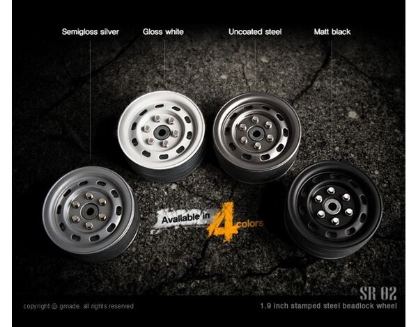 Stylish rock crawler beadlock wheel from Gmade. Available in 4 colors - Matt black, Gloss white, Semigloss silver and Uncoated steel