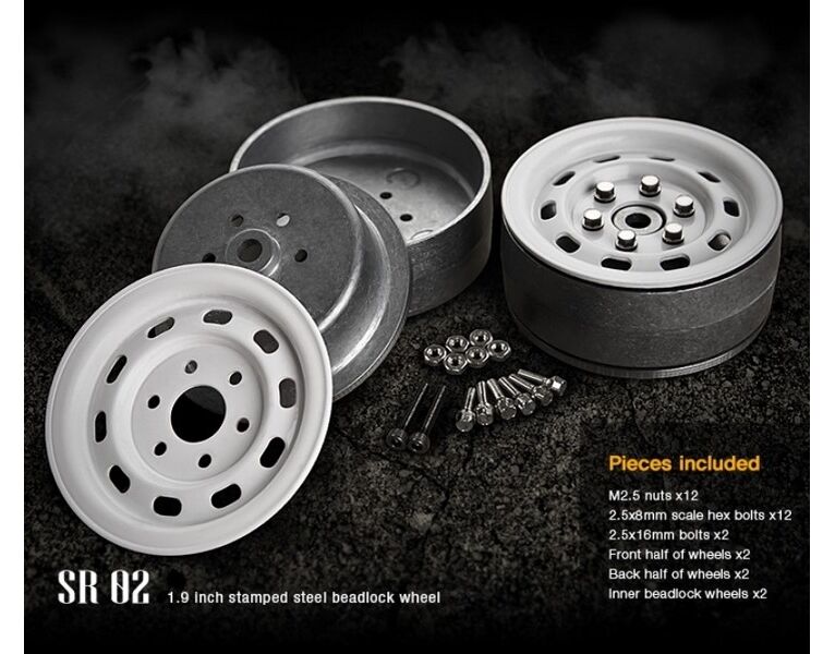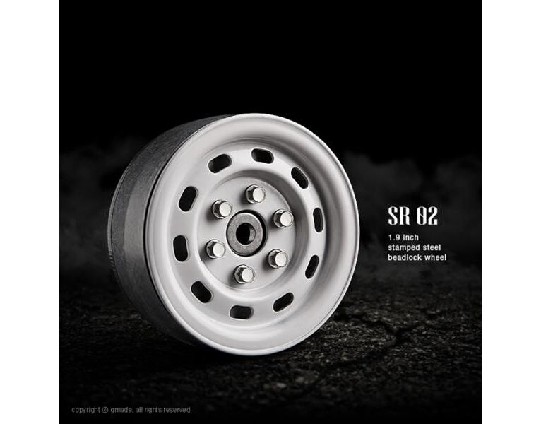 GM70176 Gmade 1.9 SR02 Beadlock Wheels (Gloss white) (2) 1 Paar Felgen mit 12mm HEX für 1.9" Scale Crawler Reifen Stylish rock crawler beadlock wheel from Gmade. Available in 4 colors - Matt black, Gloss white, Semigloss silver and Uncoated steel Gmade SR02 Features: True beadlockwheels - No gluing Dual side beadlock system Stamped steel wheel This wheel is uncoated and it will rust when exposed to the natural elements Realistic scale design Two type of assembly methods Fits 12mm hex hubs and most 1.9 inch size tyres Easy installation What's included: Front half of wheels (Uncoated steel) x 2 Back half of wheels x 2 Inner beadlock wheels x 2 2.5*8mm Allen bolts x 12 2.5*15mm Allen bolts x 2 M2.5 nuts x 12 Spec Check: Width: 22mm Diameter: 48mm (1.9inch) Offset: 2mm Positive offset Hex size: 12mm