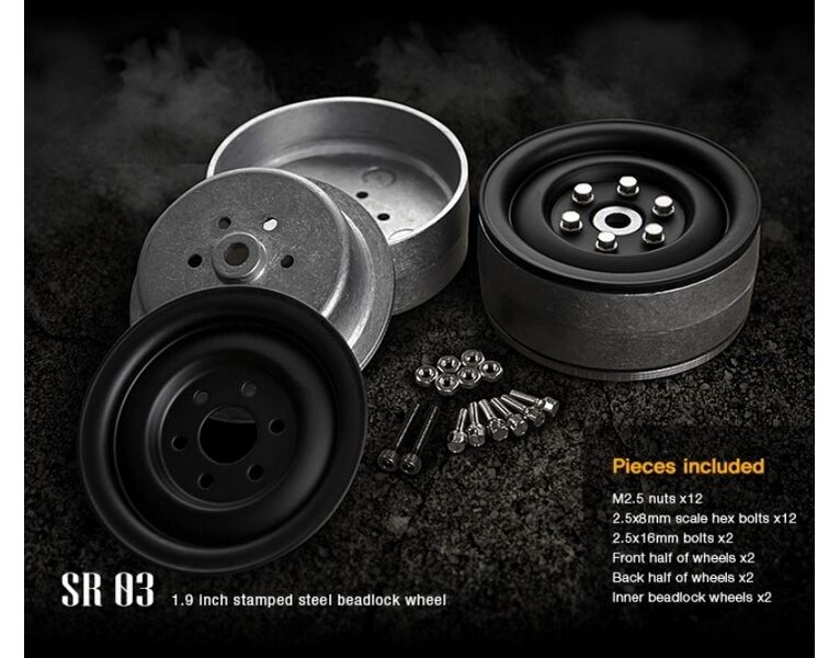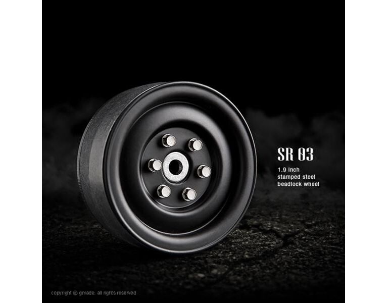 GM70184 Gmade 1.9 SR03 Beadlock Wheels (Matt black) (2) 1 Paar Felgen mit 12mm HEX für 1.9" Scale Crawler Reifen Stylish rock crawler beadlock wheel from Gmade. Available in 4 colors - Matt black, Gloss white, Semigloss silver and Uncoated steel Gmade SR03 Features: True beadlockwheels - No gluing Dual side beadlock system Stamped steel wheel This wheel is uncoated and it will rust when exposed to the natural elements Realistic scale design Two type of assembly methods Fits 12mm hex hubs and most 1.9 inch size tyres Easy installation What's included: Front half of wheels x 2 Back half of wheels x 2 Inner beadlock wheels x 2 2.5*8mm Allen bolts x 12 2.5*15mm Allen bolts x 2 M2.5 nuts x 12 Spec Check: Width: 22mm Diameter: 48mm (1.9inch) Offset: 2mm Positive offset Hex size: 12mm