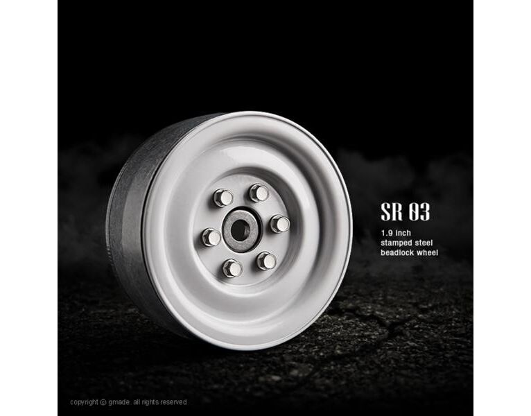 GM70186 Gmade 1.9 SR03 Beadlock Wheels (Gloss white) (2) 1 Paar Felgen mit 12mm HEX für 1.9" Scale Crawler Reifen Stylish rock crawler beadlock wheel from Gmade. Available in 4 colors - Matt black, Gloss white, Semigloss silver and Uncoated steel Gmade SR03 Features: True beadlockwheels - No gluing Dual side beadlock system Stamped steel wheel This wheel is uncoated and it will rust when exposed to the natural elements Realistic scale design Two type of assembly methods Fits 12mm hex hubs and most 1.9 inch size tyres Easy installation What's included: Front half of wheels x 2 Back half of wheels x 2 Inner beadlock wheels x 2 2.5*8mm Allen bolts x 12 2.5*15mm Allen bolts x 2 M2.5 nuts x 12 Spec Check: Width: 22mm Diameter: 48mm (1.9inch) Offset: 2mm Positive offset Hex size: 12mm