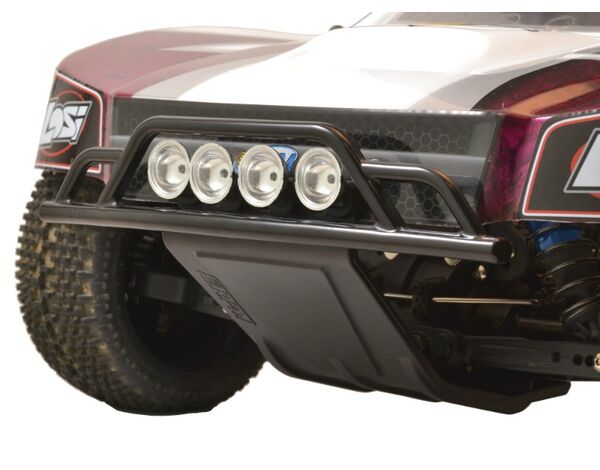 The RPM Front Bumper and Skid Plate for the Losi Ten SCTE adds a level of protection unmatched by any other bumper presently available. The RPM Front Bumper mounts further back along the chassis than the stock bumper, covering the entire front end left exposed by the stock bumper, protecting the aluminum chassis from abrasion damage common to this area. Three skid rails are strategically placed along the front of the skid plate to allow the front end of the truck to transition up and over impacted objects easily and with the least amount of friction possible.