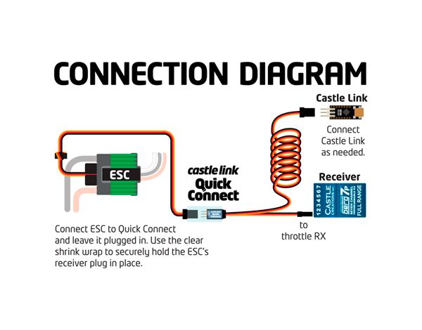 Follow the Connection Diagram (found on the inside of the package) when connecting the Quick Connect. Don't forget to use the included piece of heat shrink tube to secure the ESC lead to the Quick Connect