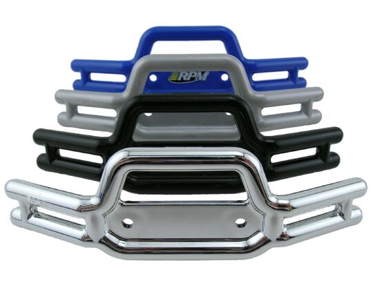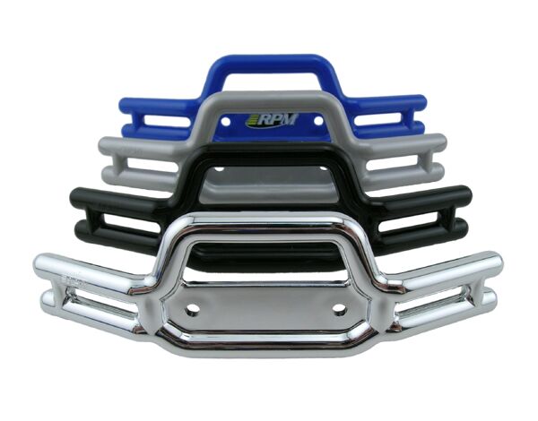 RPM provides the added protection the Revo needs with unbelievable strength and durability in our tubular front and rear bumpers. RPM bumpers for the Traxxas Revo are made from our bulletproof blend of nylons. RPM nylons are the best material for protecting your Revo since our materials are lightweight, inexpensive, and tougher than anything else available! We’ve re-engineered the front and rear bumpers to improve strength, especially around the screw holes, which eliminates potential weak points, and we’ve designed a recessed flat where with a little creativity, anyone can add in a customized, scale license plate. Additionally, our rear bumper has a flat area perfect for adding a ball stud for a faux ball hitch (see our FAQ page of our website for more information). Our colors are molded into each bumper so scratches and nicks won’t cut through to a different color underneath. In addition, our chrome bumpers are molded over our metallic silver bumper so scratches won’t show as easily as a stock bumper (where black is the base color). RPM bumpers carry our lifetime warranty against breakage and will hold up to the roughest of punishment.