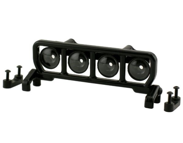 The goal of our Narrow Roof-Mounted Light Bar Set was to recreate a scale version of those light bars found in full-sized racing while striving for some reasonable amount of crash-survivability. Our Light Bar Set uses a unique hinged system that in the event of a rollover, the light bar will fold against the body to help reduce impact damage. The light set is designed to bolt to the front windshield of the truck (although with sufficient room, it can be mounted to the rear window as well), keeping the profile low and in the perfect position to light up the night. Each kit comes with a pair of large backing plates that help protect the body where the screws hold the light bar in place.