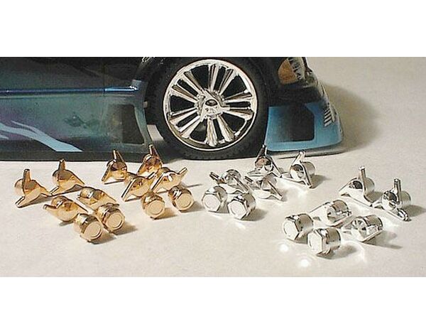 Go scale by ditching that ugly wheel nut & replace it with a set of RPM wheel nuts & knock off’s. In this kit, you’ll receive 4 hex nuts, 4 directional three spoke K.O.’s, & 4 directional two spoke K.O.’s. All of them have been covered with a high luster “chrome” finish. Scale realism never looked so good!