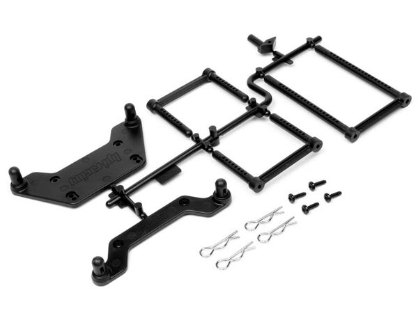 Wheely King Besitzer können jetzt den Karosseriehalter Set aus dem Crawler Conversion Set separat bestellen. Dieser Karosseriehalter Set erlaubt es, Savage Karosserien unter Verwendung der vorgezeichneten Montage-Punkte der Karosserie auf einen Wheely King zu montieren . Die Teile sind aus schwarzem Nylon für extreme Haltbarkeit hergestellt. Der Set beinhaltet vordere und hintere, verstelbare Karosserie Pfosten, Klammern und einen Antennenhalter.