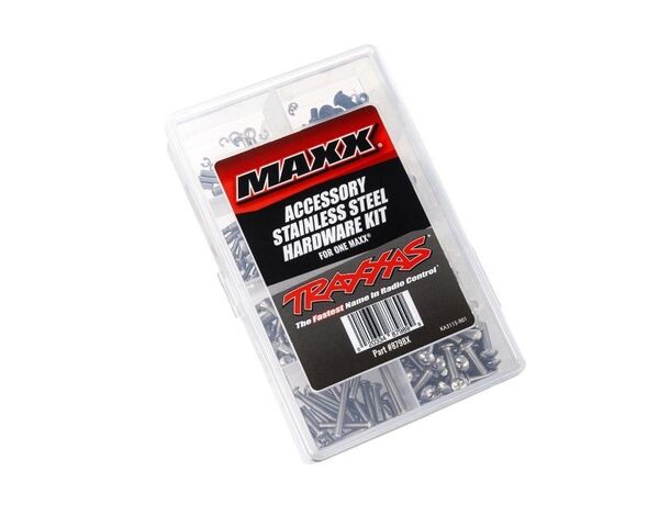 Maxx Stainless Hardware KitGive your Traxxas Maxx a complete upgrade with this stainless steel hardware kit. The hardware kit replaces the standard hardware on your vehicle with stainless steel hardware for long-lasting performance in wet conditions. Hex-drive heads deliver a positive and secure connection for easy installation and removal. Individual compartments keep everything organized in the box with a handy label to measure and identify the parts.