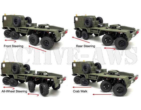 Das revolutionäre aktive Allradlenksystem (Active-AWS) des Terranaut 8X8 ermöglicht die unabhängige Steuerung der Vorder- und Hinterräder über einen 6-Kanal-FlySky-Sender. Mit dem Standardlenkrad und einem daumenbetätigten Schwenkhebel können enge U-Turns, Crab Walk Manöver sowie das unabhängige Ansteuern der Vorder- und/oder Hinterradlenkung nach Belieben und dabei vollständig proportional ausgeführt werden.