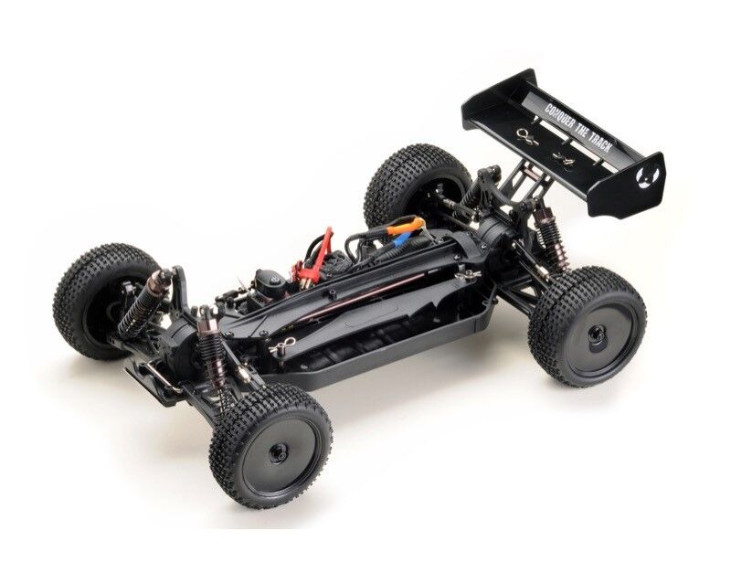 Das Auto wird von einem 3421KV Brushless Motor befeuert, der direkt auf den Allradantrieb zugreift. Die beiden Differentiale (vorne und hinten) werden durch eine Aluminium-Antriebswelle angetrieben. Ein 6kg-Servo übernimmt die Umsetzung der Lenkbefehle. Die Motor/Reglereinheit kann auch mit einem 3S/11.1V LiPo Akku versorgt werden (Größe des Batteriefachs beachten!), jedoch erhöht sich der Verschleiß des Fahrzeugs dadurch extrem. Auch das Handling wird durch die enorme Übermotorisierung nahezu unmöglich. Deshalb raten wir grundsätzlich von einem 3S Fahrbetrieb ab.