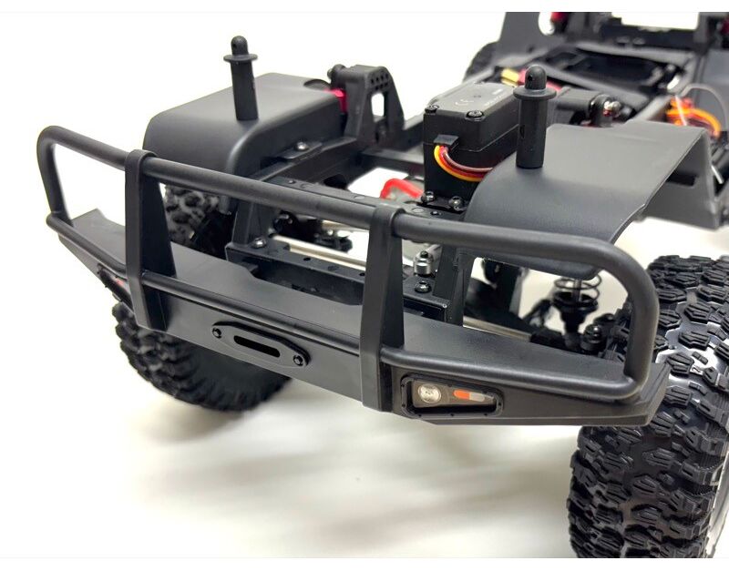 Der massive Frontbumper, das Wannenchassis mit variablen Dämpferaufnahmen und die Vollmetall-Antriebskomponenten garantieren Langlebigkeit und Performance auf jedem Trail.