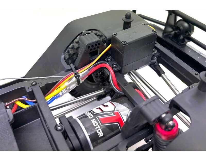 Unter der Karosserie steckt das bewährte CR4.4-Chassis, das für extreme Stabilität und hervorragende Geländetauglichkeit steht. Der kraftvolle 550er 32T High-Torque-Motor überträgt seine Leistung über ein robustes Mitteldifferential und einen vollständig kugelgelagerten Antriebsstrang auf alle vier Räder. Der wasserdichte Hobbywing 1060-Regler ist 2–3S LiPo-fähig und liefert zuverlässig Power in jeder Fahrsituation.