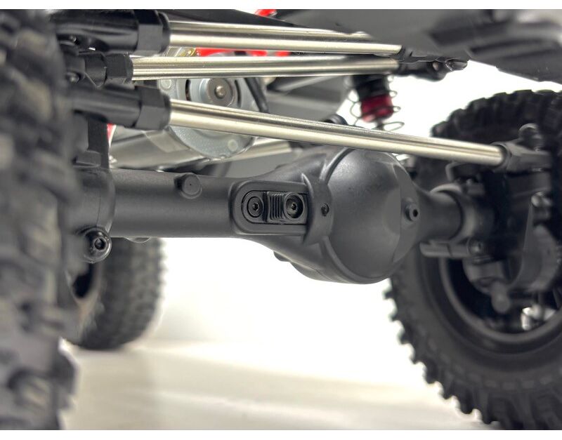 Das LCG (Low Center of Gravity) Chassis sorgt für einen tiefen Schwerpunkt und optimale Balance im Gelände. Die ECO-Version steht keineswegs für Verzicht – im Gegenteil: Sie verfügt über ein umschaltbares 2-Gang-Getriebe, manuell sperrbare Differentiale und Portalachsen für maximale Bodenfreiheit. Der 25 kg MG-Lenkservo mit Metallgetriebe und Aluminiumhorn sorgt für präzise Lenkung, auch unter Last.