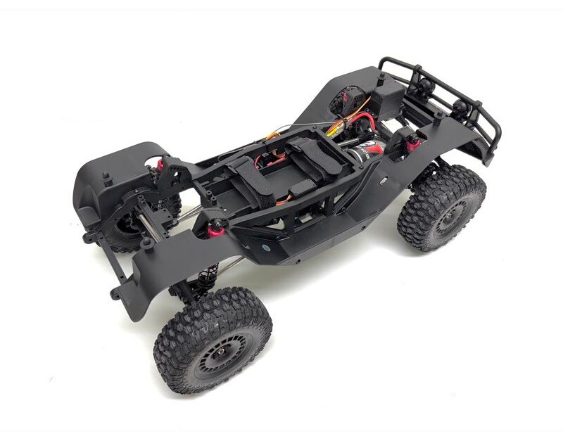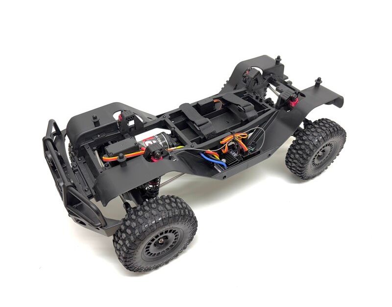 Der massive Frontbumper, das Wannenchassis mit variablen Dämpferaufnahmen und die Vollmetall-Antriebskomponenten garantieren Langlebigkeit und Performance auf jedem Trail.