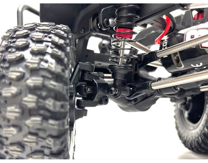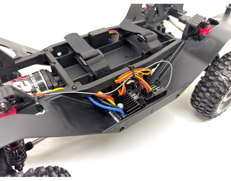 Unter der Karosserie steckt das bewährte CR4.4-Chassis, das für extreme Stabilität und hervorragende Geländetauglichkeit steht. Der kraftvolle 550er 32T High-Torque-Motor überträgt seine Leistung über ein robustes Mitteldifferential und einen vollständig kugelgelagerten Antriebsstrang auf alle vier Räder. Der wasserdichte Hobbywing 1060-Regler ist 2–3S LiPo-fähig und liefert zuverlässig Power in jeder Fahrsituation.