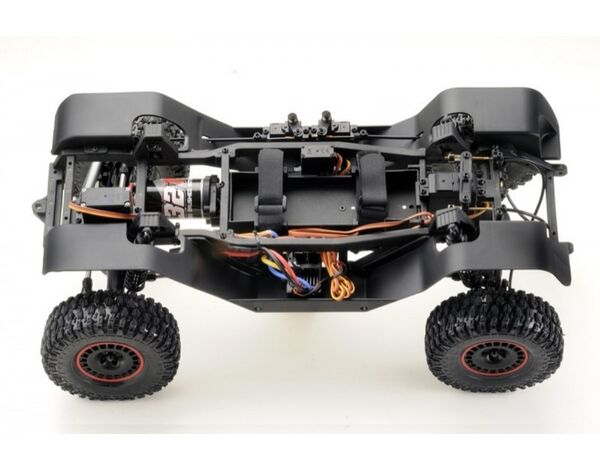 Das komplett neu konzipierte wannenartige Chassis bietet viele Vorteile! Alle elektronischen Komponenten sind leicht zugänglich, was bei der verbauten Technik dringend erforderlich ist. Das extrem flache "Low Center of Gravity" (LCG) Chassis und die dazu passende Getriebebox senken den Schwerpunkt, was besonders bei hohen Karosseriekonzepten wie unserem WOLF hilfreich ist. Die mittig platzierte Batteriebox kann dank Klettverschluss und verstellbarer Halterung perfekt an alle 2-3S LiPo und 6-7 Zellen NiMH Batterien angepasst werden. Die 11-Kanal Fernsteuerung ist notwendig, um alle technischen Features zu steuern. Die separate 3-in-1 ESC/Empfängereinheit und Lichteinheit ermöglichen zukünftige Optimierungen und Tuning.