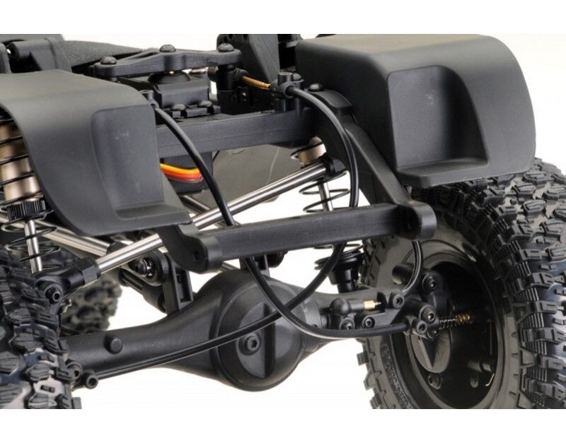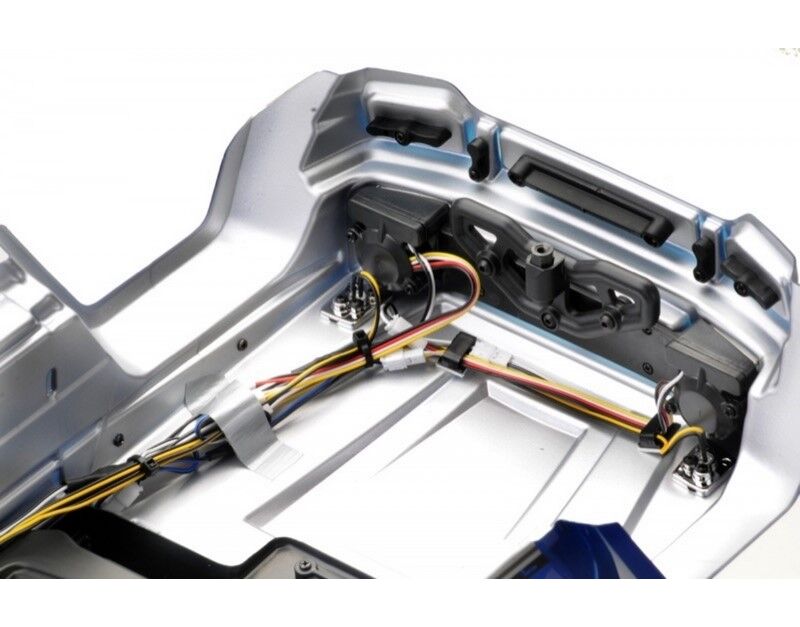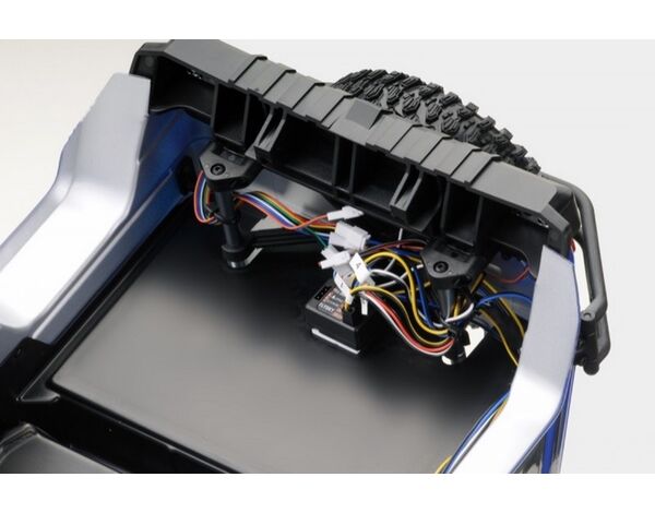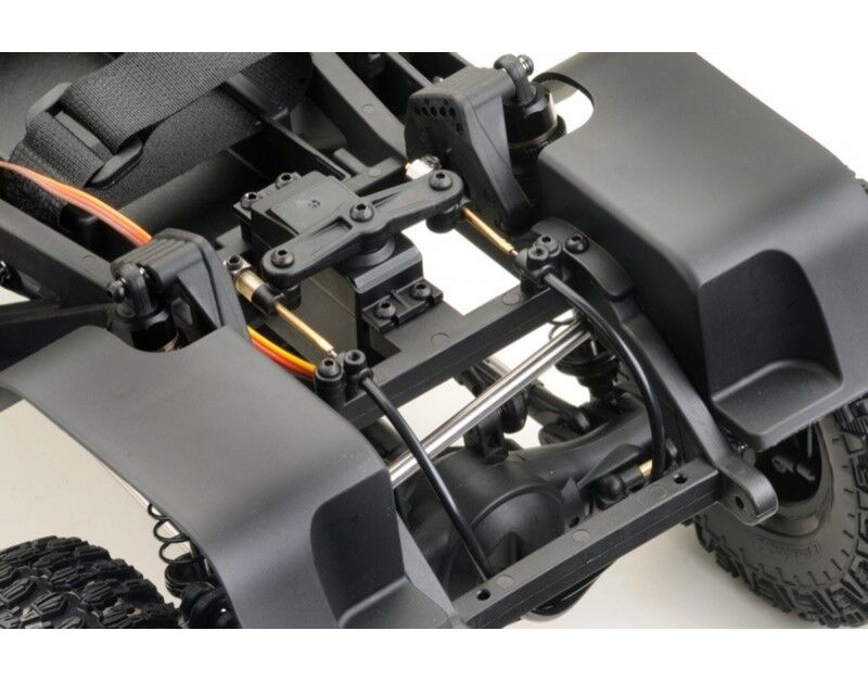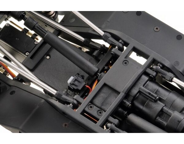 Das komplett neu konzipierte wannenartige Chassis bietet viele Vorteile! Alle elektronischen Komponenten sind leicht zugänglich, was bei der verbauten Technik dringend erforderlich ist. Das extrem flache "Low Center of Gravity" (LCG) Chassis und die dazu passende Getriebebox senken den Schwerpunkt, was besonders bei hohen Karosseriekonzepten wie unserem WOLF hilfreich ist. Die mittig platzierte Batteriebox kann dank Klettverschluss und verstellbarer Halterung perfekt an alle 2-3S LiPo und 6-7 Zellen NiMH Batterien angepasst werden. Die 11-Kanal Fernsteuerung ist notwendig, um alle technischen Features zu steuern. Die separate 3-in-1 ESC/Empfängereinheit und Lichteinheit ermöglichen zukünftige Optimierungen und Tuning.