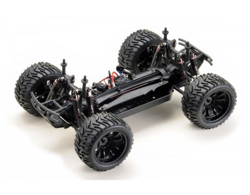 Das Auto wird von einem 3421KV Brushless Motor befeuert, der direkt auf den Allradantrieb zugreift. Die beiden Differentiale (vorne und hinten) werden durch eine Aluminium-Antriebswelle angetrieben. Ein 15kg Lenkservo mit Metallgetriebe übernimmt die Umsetzung der Lenkbefehle. Die Motor/Reglereinheit kann auch mit einem 3S/11.1V LiPo Akku versorgt werden (Größe des Batteriefachs beachten!), jedoch erhöht sich der Verschleiß des Fahrzeugs dadurch extrem. Auch das Handling wird durch die enorme Übermotorisierung nahezu unmöglich. Deshalb raten wir grundsätzlich von einem 3S Fahrbetrieb ab.