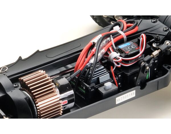 Das Auto wird von einem 540er 15T Bürstenmotor befeuert, der direkt auf den Allradantrieb zugreift. Die beiden Differentiale (vorne und hinten) werden durch eine Aluminium-Antriebswelle angetrieben. Durch die höhere Leistung des Fahrtenreglers und den Einsatz von T-Steckern kann jeder 2S LiPo-Akku verwendet werden - egal welche C-Rate und Kapazität.