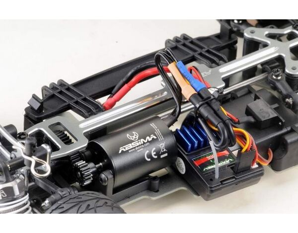 Angetrieben von einem 380er Brushless-Motor mit 3300KV und eine 30A Empfänger/Fahrtenreglereinheit mit T-Hochstromstecker ist man schon flott unterwegs und der wahnsinnige Drehmoment sorgt für ordentliche Drifts! Der Antrieb erfolgt durch ein 16Z Aluminium Motorritzel (Mod.0.6 / 2.3mm Motorwelle) und einem 40Z Hauptzahnrad. Solltest Du mal die Übersetzung ändern wollen, denk bitte daran, dass die Motorwelle einen Durchmesser von 2.3mm hat. Dementsprechend musst Du beim Kauf des Motorritzels darauf achten. Die Befeuerung erfolgt durch einen 1500mAh 7.4V/2S LiPo Akku. Dazu gibt es ein passendes 20W/800mAh LiPo Schnellladegerät.