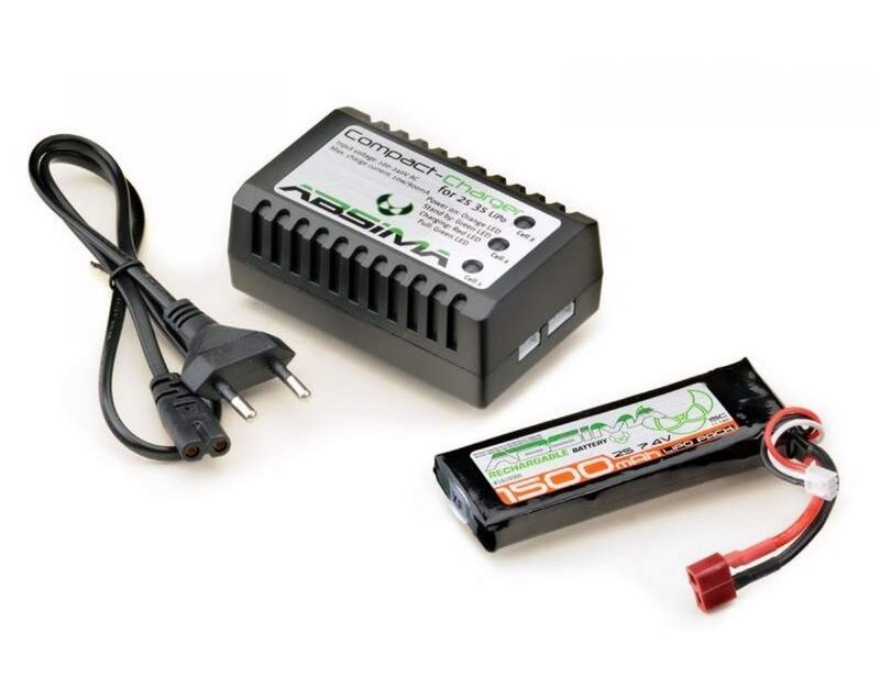Angetrieben von einem 380er Brushless-Motor mit 3300KV und eine 30A Empfänger/Fahrtenreglereinheit mit T-Hochstromstecker ist man schon flott unterwegs und der wahnsinnige Drehmoment sorgt für ordentliche Drifts! Der Antrieb erfolgt durch ein 16Z Aluminium Motorritzel (Mod.0.6 / 2.3mm Motorwelle) und einem 40Z Hauptzahnrad. Solltest Du mal die Übersetzung ändern wollen, denk bitte daran, dass die Motorwelle einen Durchmesser von 2.3mm hat. Dementsprechend musst Du beim Kauf des Motorritzels darauf achten. Die Befeuerung erfolgt durch einen 1500mAh 7.4V/2S LiPo Akku. Dazu gibt es ein passendes 20W/800mAh LiPo Schnellladegerät.