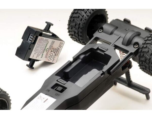 Der herausnehmbare 3,7V 300mAh LiPo-Akku wird über ein USB-Ladegerät geladen, mit einer Ladezeit von ca. 30-40 Minuten und einer Fahrzeit von ca. 20 Minuten.