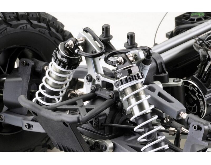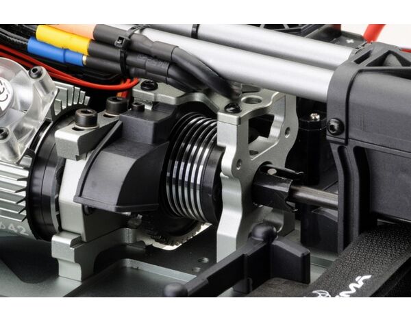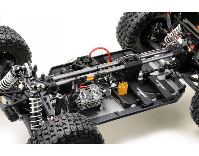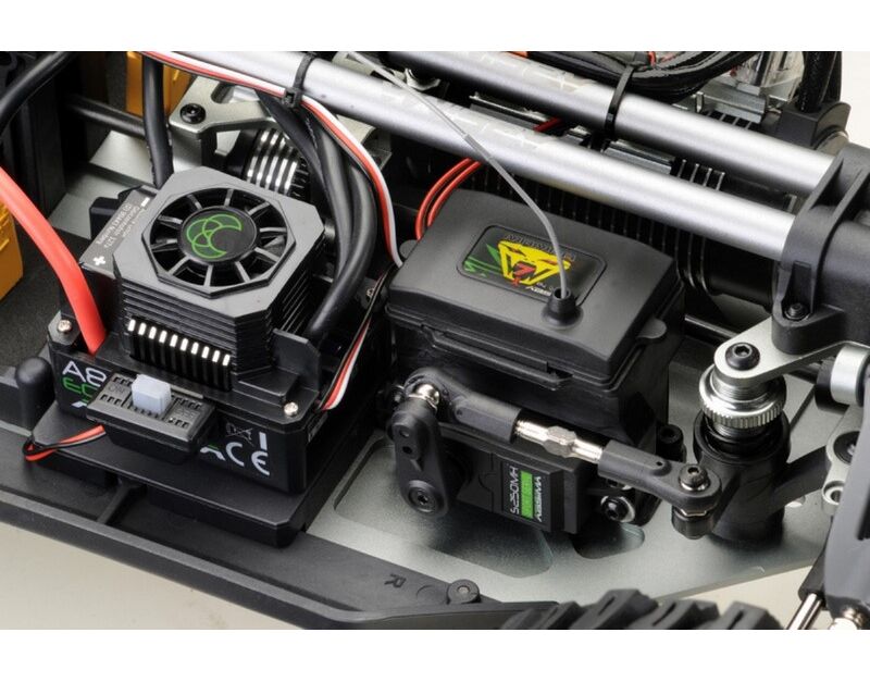 Das Herzstück hat Power! Der Fahrtenregler (ESC) mit seinen 150A Dauerstrom besitzt ebenfalls einen Lüfter welcher für eine perfekte Betriebstemperatur sorgt. Befeuert wird die Elektronik von entweder zwei 2S Akkus oder zwei 3S Akkus mit XT90 Hochstromsteckern welche perfekt in die zwei Batteriefächer im hinteren Teil des Fahrzeugs passen. Durch die durchdachte Aufteilung aller Komponenten ist eine optimale Gewichtsverteilung garantiert.