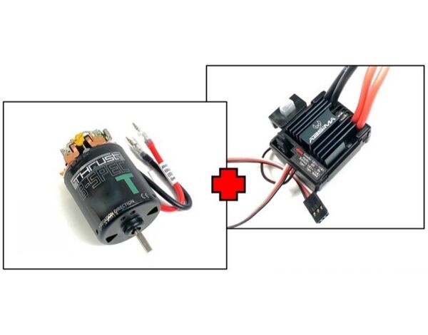 ABSIMA Combo V2 Motor 55T Brushed - Regler 80A Wasserdicht HIGHLIGHTS: Ein ESC passend für alle Fahrzeugtypen (Crawler, Off-road, On-road, Boot) Programmierbar über Jumper und separat erhältlicher Programmierkarte (Art. 2110061) 2S LiPo Betrieb empfohlen Motor fertig verlötet - plug-n-play Programmierbare Features (über Programmierkarte): Initial Start Force (Anfahrtskraft): 5%* / 13% / 21% / 29% Low V cut-off (Unterspannungsschutz): 3.1V* / 3.4V / Off Crawler Setup - Initial Drag Brake (Motorbremse): 100%* / 90% / 80% / 70% Standard Setup - Max Brake Force (Bremskraft): 50%* / 100% / 75% / 25% Max Reverse Force (Rückwärtsfahrt): 50%* / 75% / 100% Start Mode (Punch): Medium* / Strong / Soft Standard Features ESC: Wasser- und Staubdicht - geeignet für alle Wetterbedingungen (Reinigen und trocknen Sie den ESC nach jedem Gebrauch, um Korrosionen zu vermeiden). Spezeill für BRUSHED RC Cars und Crawler für eine exzellente Beschleunigung und feinfühliges Fahrgefühl entwickelt. Geringer Innenwiderstand und hervorragende Wärmeableitung. Mehrere Schutzfunktionen wie Unterspannungsabschaltung für LiPo und NiMH Akkus, ESC-Überhitzungsschutz und Schutz vor Signalverlust. Leicht zu programmieren durch Jumper und Programmierkarte im Taschenformat (separat erhätlich - Art. 2110061) Spezifikation ESC: Dauer-/Kurzzeitbelastung: 80A/320A Widerstand: 0.0014ohm Geeignete Motor Typen: Brushed Standard Motoren Batterie Empfehlung: 2S LiPo / 6 Zellen NiMH BEC 6.0V/5A Motor Limit 2S LiPo/5-6 Zellen NiMH: ≥ 11T oder <25.000U/Min Maße: 41.5*35*29.5mm Stecksystem: T-plug Gewicht: 63.4g Spezifikation B-Spec Motor: Turns: 55T Leerlauf Drehzahl: 7.700 U/min Abgabeleistung: 85W Betreibsspannung: 7.2-7.4V Baugröße: 540 Motorwelle: Länge 12,3mm; Ø 3,18mm Motorgröße: Länge 53,2mm; Ø 35,7mm Kugellager: 2 Gewicht: 165g Lieferumfang: 1:10 Brushed Fahrtenregler V2 Thrust B-Spec Brushed Motor Klebestreifen Bedienungsanleitung