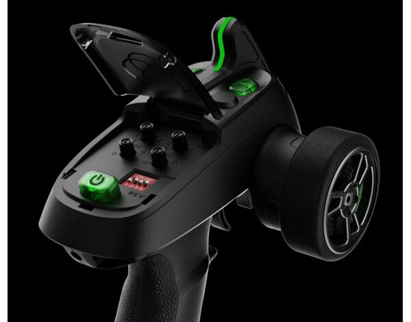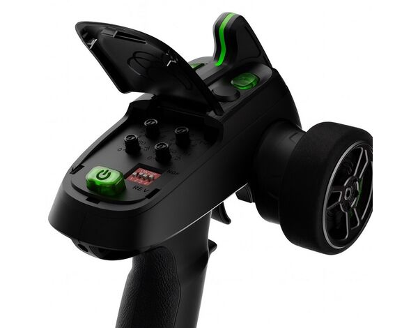 Die Buttons für Power, Kanal 3 & 4 sowie die Antenne sind bei Betrieb grün beleuchtet. Unter der großen Schutzklappe befinden sich vor Staub und Feuchtigkeit geschützt alle Regler und Knöpfe zur Feinjustierung und Reverse-Schaltung. Außerdem kann die Höchstgeschwindigkeit limitiert werden um gerade Einsteiger die ersten Fahrversuche zu erleichtern