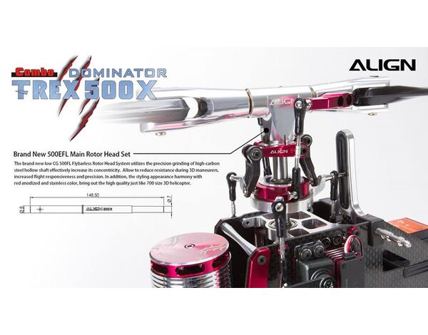 Der T-REX 500X Dominator kommt mit dem Microbeast PLUS Flybarless System daher. Als Rotorkopf kommt hier der neue Flybarless-Rotorkopf mit Taumelscheibenmitnehmer und rot eloxierten Aluminiumteilen zum Einsatz.